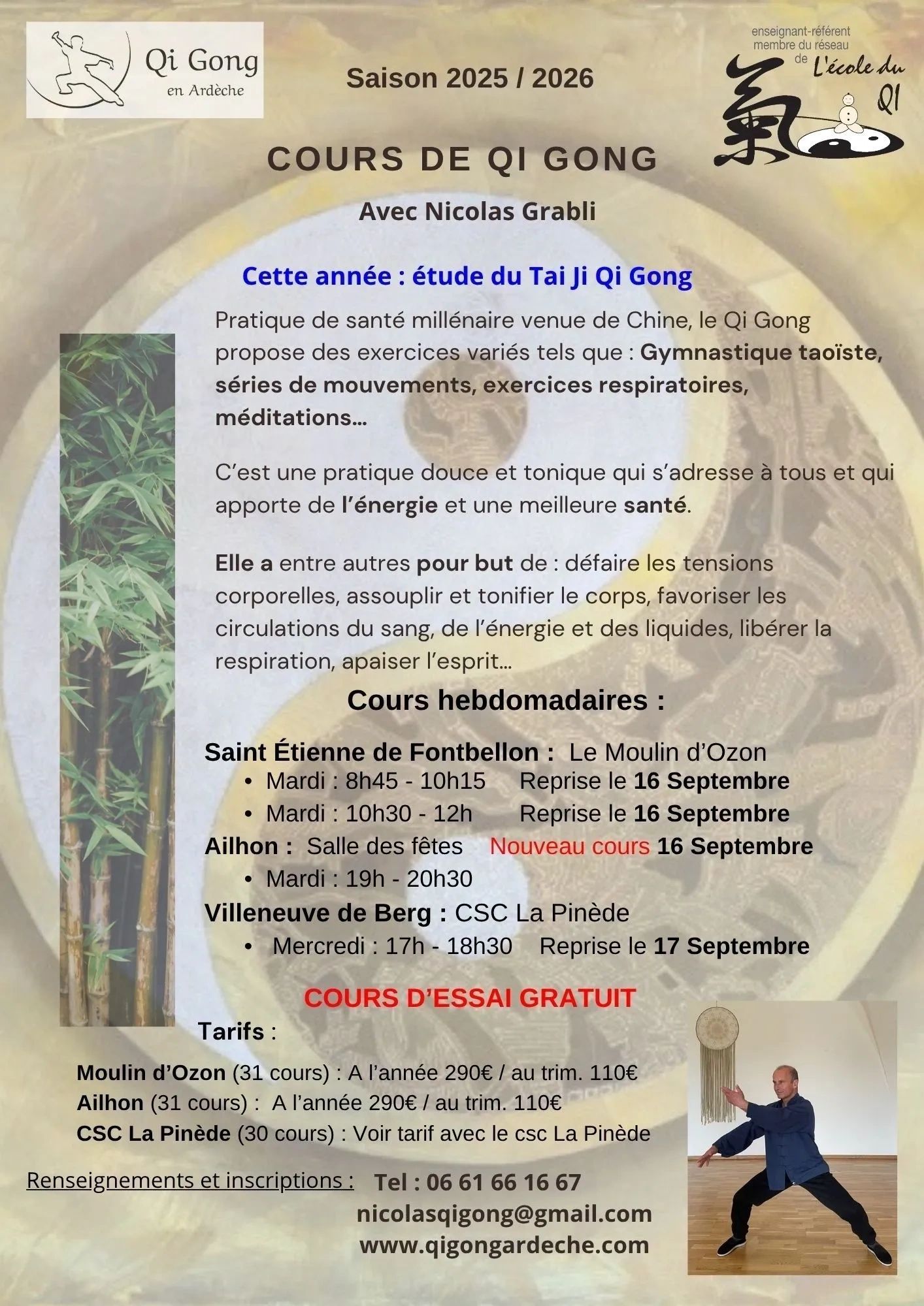 J'ai créé l'association Qi Gong en Ardèche en 2018 afin d'enseigner cette pratique pour laquelle je me passionne. Je me suis formé au Qi Gong de la lignée Yang Sheng (nourrir la vie ou le principe vital) à l'Ecole du Qi et suis issu du monde des arts martiaux chinois et des arts énergétiques de santé japonais.